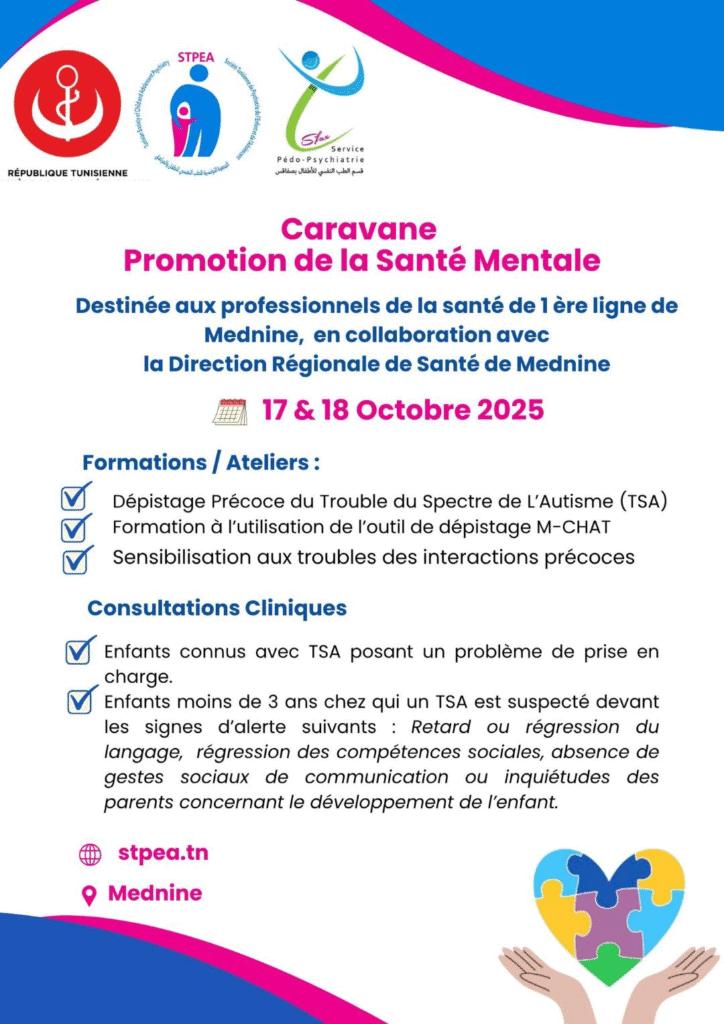 Caravane Promotion de la Santé MentaleDestinée aux professionnels de la santé de 1 ère ligne de Médenine, en collaboration avec la Direction Régionale de Santé de Médenine 17 & 18 Octobre 2025Formations/Ateliers:Dépistage Précoce du Trouble du Spectre de L’Autisme (TSA) Formation à l’utilisation de l’outil de dépistage M-CHAT Sensibilisation aux troubles des interactions précocesConsultations CliniquesEnfants […]